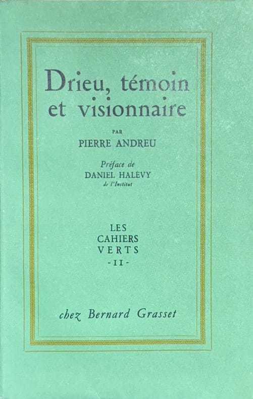 Paris. Grasset. Les Cahiers Verts. 1952. In-12 (123 x 188 mm) broché, couverture verte imprimée, 220 pages. Portrait photo de Drieu en frontispice. Edition originale, exemplaire 132/150 sur Vélin pur fil. Décharges claires des rabats de la couverture sur les gardes, sinon très bel exemplaire, non coupé, non rogné.