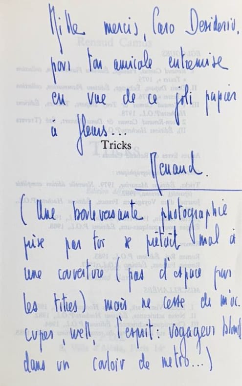 Paris P.O.L. 1988 1 vol. broché in-8, broché, couverture illustrée, 476 pp. Préface de Roland Barthes. Edition en partie originale. Bel envoi autographe signé de l'auteur "Mille mercis, Caro Desiderio, pour ton amicale entremise en vue de ce joli papier à fleurs... (une bouleversante photographie prise par toi se prêtait mal à une couverture (pas d'espace pour les titres) mais ne cesse de m'occuper, well, l'esprit : voyageur blond dans un couloir de métro...)". Très bon exemplaire.