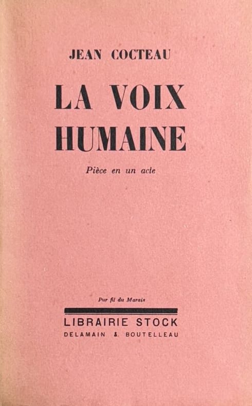 Paris, Librairie Stock, 1930. Un volume in-12 (182 x 122 mm) broché, 69 pp. + fnch., couverture de papier rose imprimée. ÉDITION ORIGINALE. 1 DES 25 EX. SUR JAPON IMPÉRIAL, CELUI-CI LE N° 7. À propos de l'œuvre : Une femme seule, dans une chambre en désordre, téléphone à son amant qui vient de la quitter pour une autre. En partant de cette situation tristement banale, Jean Cocteau a écrit une mini-tragédie en un acte — un étrange « monologue à deux voix » fait de paroles et de silences — dans laquelle le téléphone joue un rôle essentiel. « Dans le temps, écrit Cocteau, on se voyait. On pouvait perdre la tête, oublier ses promesses, risquer l'impossible, convaincre ceux qu'on adorait en les embrassant, en s'accrochant à eux. Un regard pouvait changer tout. Mais avec cet appareil, ce qui est fini est fini. » Créé en 1930 à la Comédie française par Berthe Bovy, ce texte a également été joué et enregistré par Simone Signoret. Avec cette production, Jacques Canetti réalisa l'un de ses rêves les plus chers : Simone Signoret accepta d'enregistrer la version intégrale de ce magnifique texte de Jean Cocteau, à condition qu'elle puisse le faire chez elle, dans sa chambre, étendue sur son lit, son propre téléphone à la main. Pierre Nobis, l'ingénieur du son, s'installa dans la cuisine et la première prise fut la bonne. Bouleversée par l'émotion du texte, Simone Signoret, en larmes, refusa d'écouter l'enregistrement. Il fallut l'intervention d'Yves Montand pour que Simone Signoret accepta que le disque fût publié. Il obtint immédiatement et à l'unanimité le Grand Prix du Disque en 1964. L'œuvre a été également adaptée sous forme de tragédie lyrique par Francis Poulenc en 1959, sous le même titre et portée au Cinéma par Roberto Rosselini, avec Anna Magnani dans le rôle-titre.