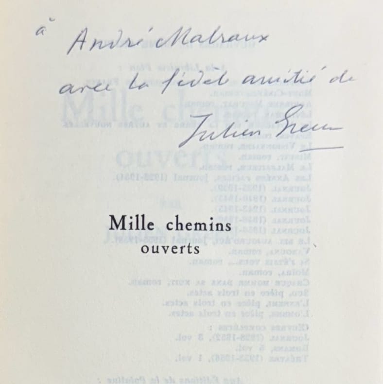 Edition originale du 2è des 3 volumes (après "Partir avant le jour", 1963) de l'autobiographie de Julien GREEN: quelques étapes des "mille chemins" pris par le jeune Julien Green, de la guerre en 1917 à son départ vers les Etats-Unis en 1919. Tirage à 1789 exemplaires: 1 des 1365 sur alfa mousse de Navarre, justifié n°50.