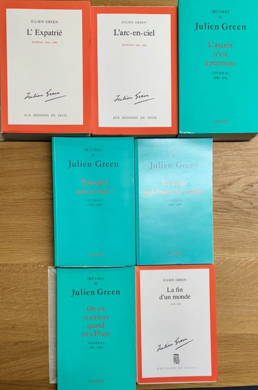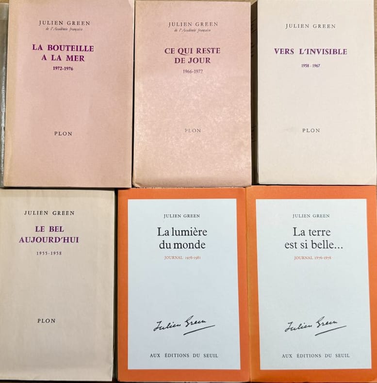 Paris Plon, coll. "La Palatine" et coll. "L'Epi"- Le Seuil - Fayard - Flammarion 1938-2001 19 vol. brochés 18 vol. in-12 à grandes marges ou in-8, brochés, non coupés pour 8 des volumes. Exceptionnelle série quasi complète du Journal de Julien Green en édition originale, en tirage de tête ou second papier : les 10 premiers volumes parus chez Plon sont sur Japon ou Madagascar (tirage entre 18 et 28 exemplaires), exceptés les tomes 1, 2 et 4 numérotés sur Hollande (tirage entre 17 et 28 exemplaires). Les tomes 5 et 6 sont enrichis d'un envoi autographe signé de l'auteur à l'éditeur Charles Orengo, alors directeur littéraire chez Plon (et qui deviendra directeur puis président de Fayard quelques années plus tard !).Les 8 volumes suivants parus au Seuil et chez Fayard sont l'un des 65, 75 ou 80 exemplaires numérotés sur vergé Ingres de Lana, seul tirage en grand papier. Bien complet du tome non numéroté, publié entre les tomes 14 et 15, intitulé "On est si sérieux quand on a 19 ans" (1/80 vergé Ingres) et qui revient sur la période 1919-1924.On joint un 19e volume, complément et parenthèse à cet ensemble : La fin d'un monde, juin 1940 (in-8, broché, Le Seuil, 1992, 1/80 vergé Ingres de Lana, seul tirage en grand papier).Manque le tome 18 et dernier (1997-1998), paru chez Flammarion en 2006, dont il n'a pas été tiré de grand papier. Rare réunion. Tenu sur près de 80 ans, ce Journal est un monument de la littérature du XXème siècle de par sa longévité et son aventure éditoriale rocambolesque (après les années chez Plon, l'auteur enchaîne les éditeurs allant jusqu'au conflit juridique avec Fayard). Julien Green se pose en spectateur engagé et confesse sa vie au fil d'une écriture d'une simplicité aisée, nous montrant un homme dans son siècle, dans son intimité, dans ses combats, sans qu'aucun de ces éléments ne l'emporte.