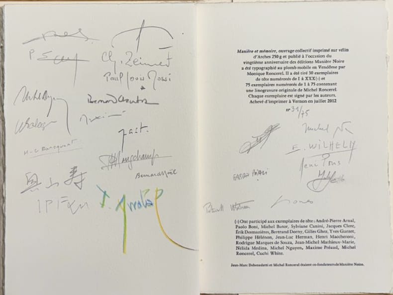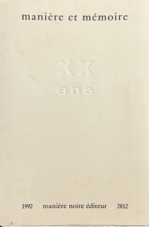 [Vernon] Manière Noire 2012 1 vol. en feuilles grand in-8, en feuilles, couverture à rabats, 33 + (5) pp. Edition originale. Un des 75 exemplaires numérotés sur vélin d'Arches, seul tirage après 30 exemplaires de tête. Ouvrage collectif publié à l'occasion du vingtième anniversaire des éditions Manière Noire, avec des textes et poèmes de Fernando Arrabal, Marie-Claire Bancquart, Michel Butor, Jean-Pierre Faye, Bernard Noël, Michel Pastoureau, Yves Peyré, René Pons, Christian Zeimert, etc. Exemplaire signé par tous les auteurs au colophon, mais sans la linogravure de Michel Roncerel annoncée. Couverture légèrement poussiéreuse.