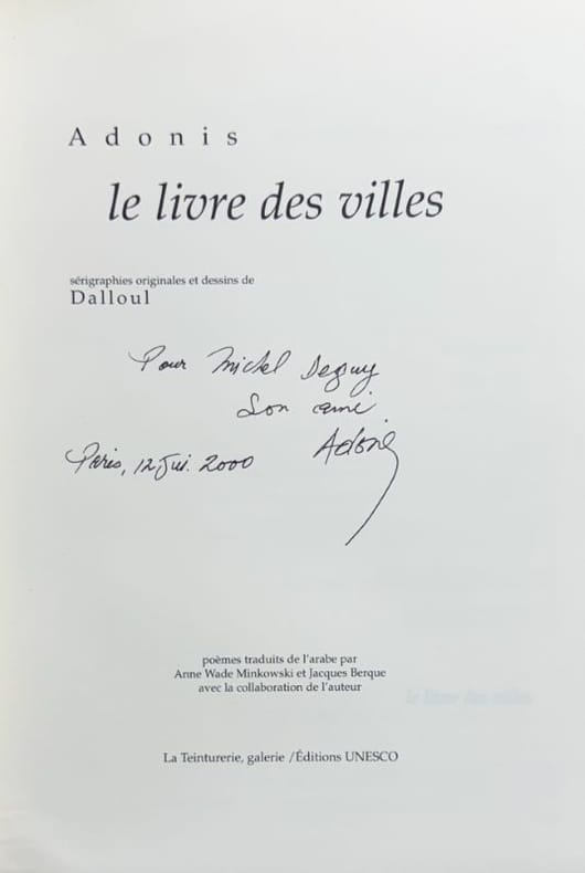 Paris La Teinturerie, Editions UNESCO 1999 1 vol. broché in-4, broché, 204 + 187 pp., dessins en noir de Ziad Dalloul. Poèmes traduits de l'arabe par Jacques Berque et Anne Wade Minkowski, avec la collaboration de l'auteur. Edition originale. Un des 500 exemplaires numérotés comprenant une sérigraphie originale de Dalloul numérotée et signée. Envoi autographe signé de l'auteur à un poète et critique. Petit mouillure en pied du dos, atteignant le coin inférieur de la sérigraphie. Sinon en bon état général.