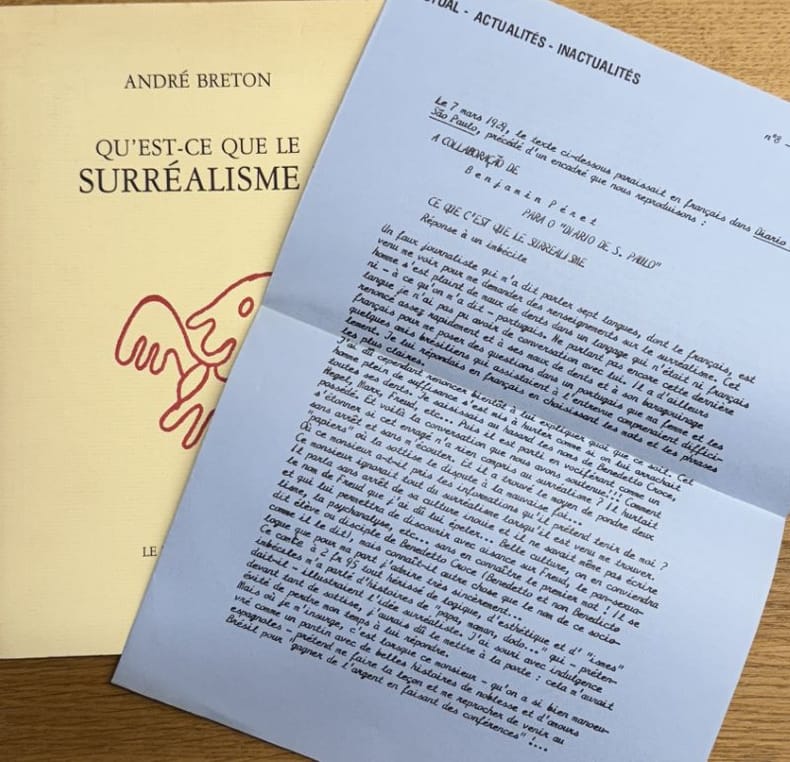 Cognac Le Temps qu'il fait 1986 1 vol. broché gr. in-8, broché, 29 pp. Nouvelle édition au tirage limité à 1000 exemplaires sur vélin teinté, celui-ci l'un des 200 premiers réservés à Actual, numéroté à la main avec la mention "exemplaire de monsieur Michel Deguy". On joint 2 feuillets bleus du n° 8 d'Actual, reproduisant l'article de Benjamin Péret "Ce qu'est le surréalisme : réponse à un imbécile". Très bon état.