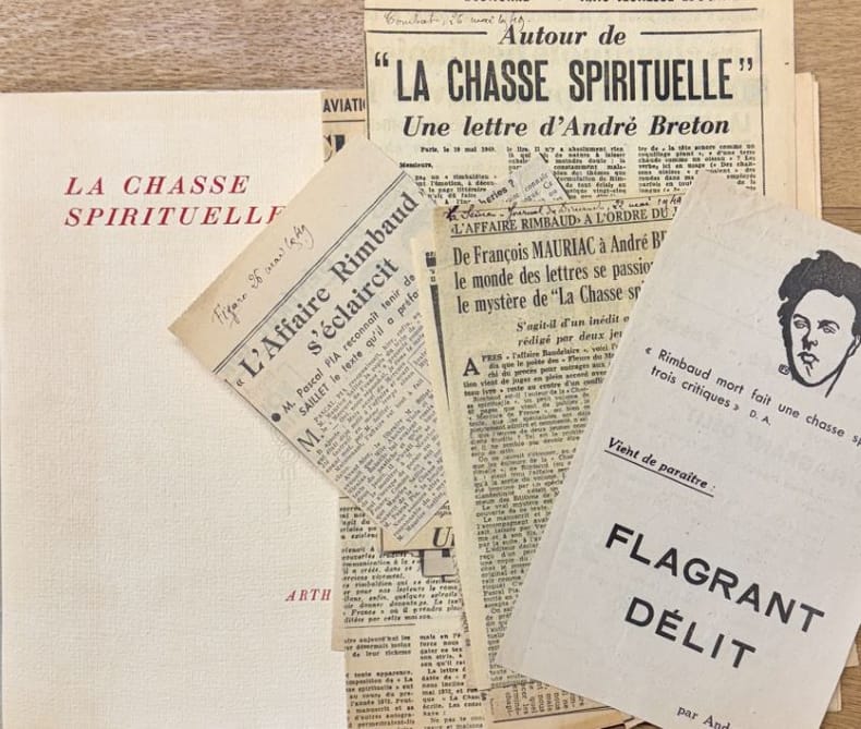 Supercherie littéraire ; Il s'agit d'un texte prétendument perdu d'Arthur Rimbaud. Pascal Pia, connu pour ses faux d'Apollinaire, de Baudelaire ou de Radiguet, publia la Chasse spirituelle, dont des extraits avaient paru dans Combat. André Breton dénonça rapidement l'imposture. Exemplaire hors-commerce sur vélin pur fil Johannot. Photos sur demande.