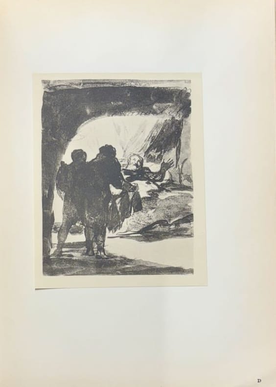 Paris société de propagations des livres d'art 1907 un volume grand in-4° (325 x 230mm), 11 pp. 38 planches (5) pp. Reliure éditeur à la Bradel cartonnée papier crème, dos et premier plat titré. (dos et plat insolés, une coiffe manquante). 38 (numérotation : 1 à 32 puis A à F) planches en noir & blanc contre collées reproduisant les dessins de F. Goya. Tiré à 600 exemplaires numérotés (n° 422). Intérieur frais. ex-libris.