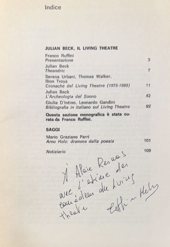 Firenze Vallecchi, Quaderni di Teatro 1986 1 vol. broché in-8, broché, 112 pp., photos en noir. Envoi autographe signé "à Alain Resnais avec l'estime des comédiens du Living Theatre" (signature illisible). Textes en italien de Julian Beck, Serena Urbani, Thomas Walker, Ilion Troya, etc. Bon état. Exemplaire provenant de la bibliothèque d'Alain Resnais.