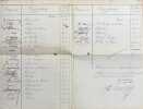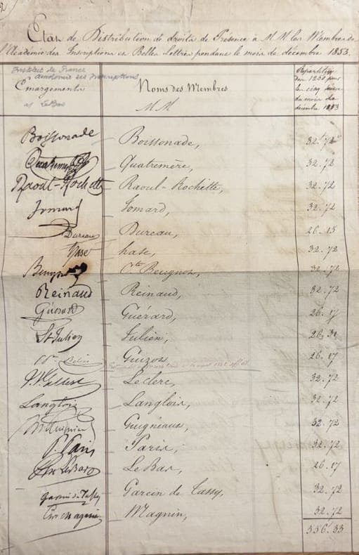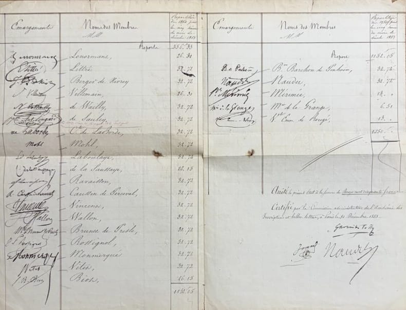 S.l.n.d. 1853 1 vol. en feuilles 2 feuillets manuscrits au format 34,5 x 22,5 cm, pliés en 2. Liste répartitive d'une somme totale de 1.250 francs, signée par 42 membres de l'Académie, dont Prosper Mérimée, Emile Littré, Abel François Villemain, Jean-François Boissonade, Edme François Jomard, Garcin de Tassy, Raoul-Rochette, etc. Petit trou d'encre causé par la signature du comte Arthur Beugnot, petite déchirure en marge supérieure, sinon beau document.