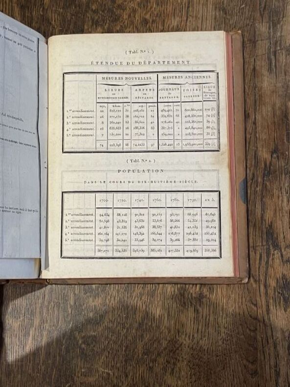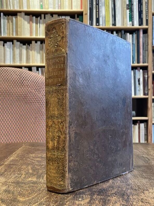 1803 Nantes, Malassis, An XII (1803/1804). 1 vol. in-4: 21 x 26 cm, xiv pp. de titre, préface et tables, [1] f. d'errata, 511 pp. de texte, 1 tableau dépliant, [53] ff. de tables statistiques. Édition originale. Reliure de l'époque en veau marbré. Dos lisse avec pièce de titre de maroquin rouge, multiples filets et fers dorés. Double encadrement à froid des plats. Filet sur les coupes. Gardes de papier marbré. Un coins émoussé sinon ouvrage en parfait état, très élégante reliure.