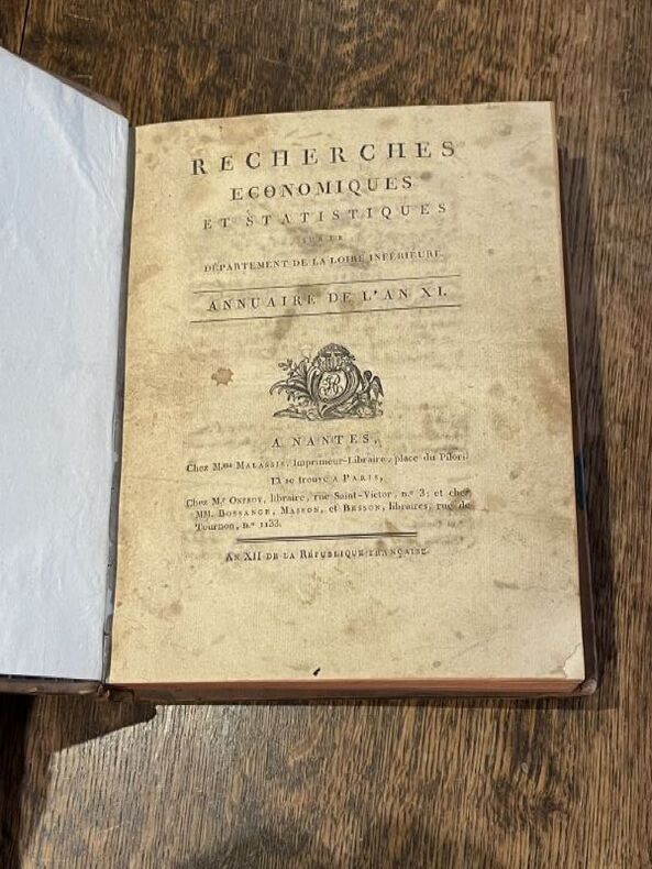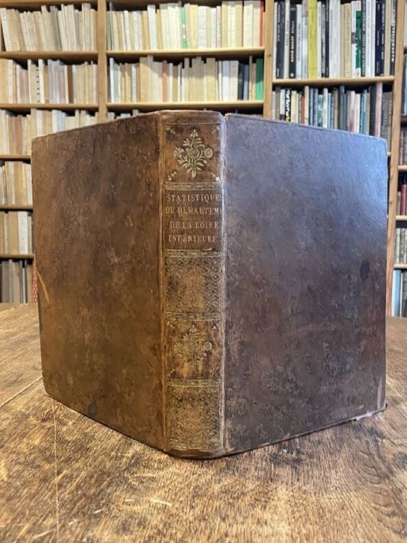Nantes Paris Malassis,Onfroy, Bossange, Masson et Besson 1803 -in-4 plein-veau un volume, reliure de l'époque plein veau brun raciné (binding full calfskin) in-quarto (27,5 x 21,3 cm), reliure d'époque, dos long (spine without raised bands) décoré or (gilt decoration) filets et roulette grecque or, titre frappé or (gilt title), pièce de titre sur fond rouge avec roulette or (pièce de titre en trés grande partie manquante), roulette grecque or en place des nerfs et en tête et en pied, coiffes manquantes et dos épidermé, plats trés légèrement frottés (cover lightly rubbed ), coins écornés, toutes trancheslisses, texte + Calendrier d'Observations Météorologiques mois par mois (12 pages) + 69 tables statistiques in-fine, (XVI + 511 + (1) page + 1 grand tableau dépliant + (12) pages de calendrier + 69 tableaux en 88 pages) Pages, [le grand tableau dépliant : "Tableau Analytique des prairies du département" Manque), AN XI (1803) Nantes : M. Malassis, Paris : Onfroy, Bossange, Masson et Besson Editeurs,