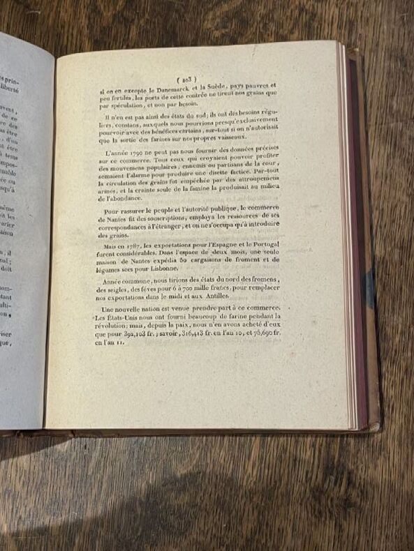 Au Sommaire : 1- ETAT PHYSIQUE : Origine, Détails Géologiques, Hydrologie, Population 2- ETAT INDUSTRIEL : Histoire, Cultures, Engrais, Prairies, Clôtures, Fermages, Assolements, Vignobles, Cidres, Produits de l'Agriculture, Dépendances et moyens de l'Agriculture, Forêts, Terres vagues et communes, Histoire des arts et métiers dans le 44, Exploitation desCarrières, Tourbes, Houille, Sel, Fers, Mines et Forges, Manufactures, Coton, Chanvre, Lainages, cuirs, poils, crins, Manufactures composées et chimiques (indiennes), Pêcheries, Histoire du Commerce de Nantes, Commerce intérieur, Extérieur, Commerce de grains, , Long-Cours (Etats-Unis), Commerce des Antilles (18 pages sur le commerce tiangulaire avec Saint-Domingue), Commerce de l'inde, 3- ETAT POLITIQUE : Division du territoire, organisation Administrative, Etat Militaire, Ecclésiastique, Contributions, Dépenses Publiques, Navigation, Dépenses Départementales, Municipale, Hopitaux du 44, secours à domicile, Etablissements Charitables, Dépenses des familles, 4- ETAT MORAL : Instruction Publique, Habitudes civiles, Habitudes domestiques, Opinions Religieuses, GUERRES CIVILES Chouans, GUERRES CIVILES Vendée, Caractères et Inclinations, Appendice Archéologique et Biographique, Catalogue des Hommes Célèbres du 44........Première édition, RARE, de cette statistique économique et politique régionale.;;;;;...en bon état malgré les petits défauts signalés (very good condition in spite of the smalls defects indicated).