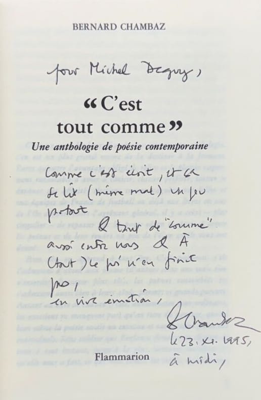Paris Flammarion 1995 1 vol. broché in-12, broché, 122 pp. Bel envoi autographe signé de l'auteur à un poète et critique. Très bon état.