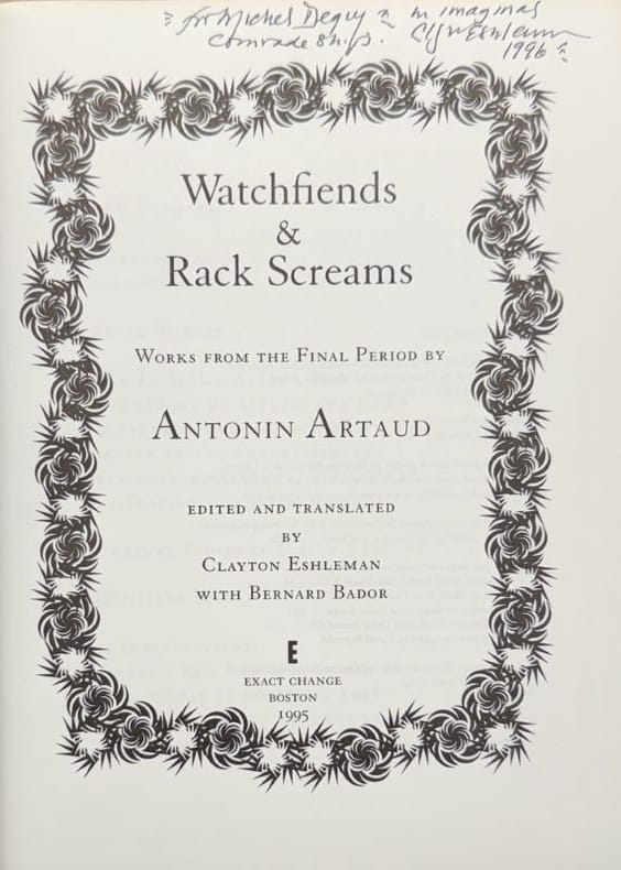 Boston Exact Change 1995 1 vol. broché in-8, broché, couverture illustrée, 342 pp. Edition originale. Edition et traduction Clayton Eshleman. Envoi autographe signé de l'auteur à un ami poète et critique. Texte français et traduction anglaise en regard. Très bon état.