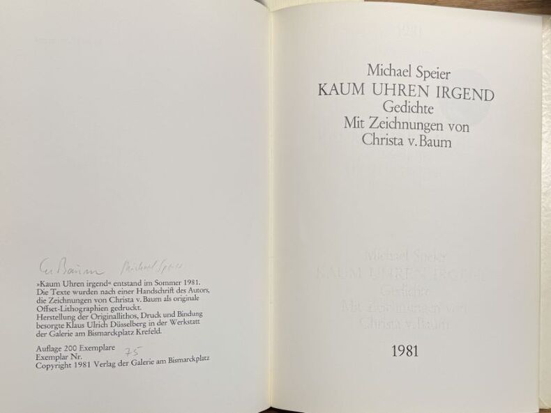 Krefeld Galerie am Bismarckplatz 1981 1 vol. broché in-4, broché, (32) p., 6 dessins en noir à pleine page de Christa v. Baum. Texte en allemand. Edition originale. Un des 200 exemplaires numérotés et signés par l'auteur et l'artiste. Très bon état.