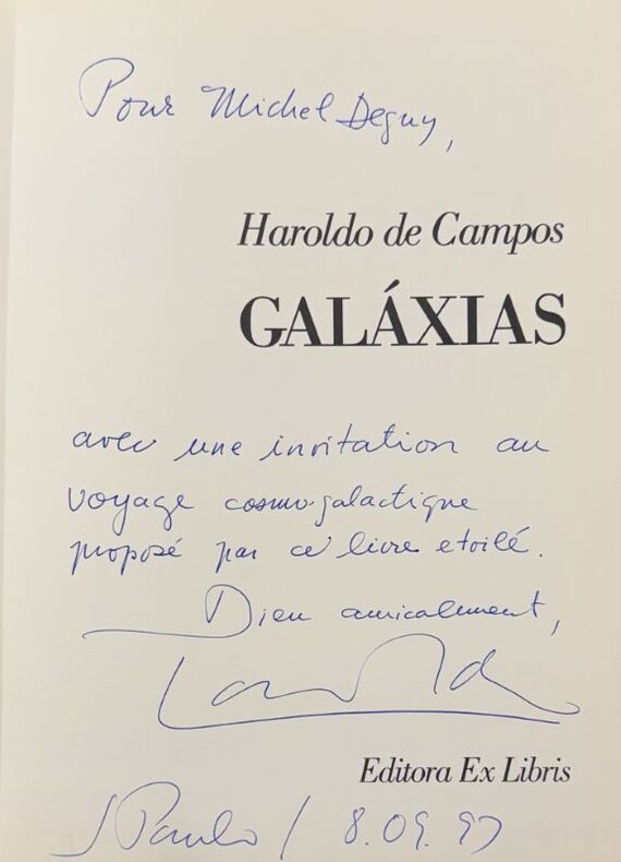 Sao Paulo Editoria Ex Libris 1984 1 vol. broché in-4, broché, non paginé. Texte en portugais. Edition originale. Bel envoi autographe signé de l'auteur à un poète et critique. Très bon état.