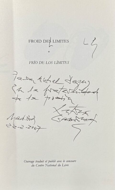 Paris Editions Lettres Vives 2000 1 vol. broché in-8, broché, couverture à rabats, 69 pp., dessins en deux tons d'Antoni Tàpies. Texte espagnol et traduction française par Jacques Ancet en regard. Envoi autographe signé de l'auteur, qui a corrigé le titre sur la couverture et la page de titre en "Froid de limites". Bon état.