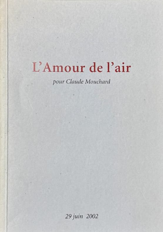 S.l. s.n. 2002 1 vol. broché in-8, broché, 47 pp. Edition originale hors commerce de ce recueil d'hommages amicaux à Claude Mouchard par J. Neefs, M. Ueda, G. Yoshimasu, G. Aïgui, T. Samoyault, P. Pachet, C. Habib, C. Lefort, M. Deguy. Très bon état.