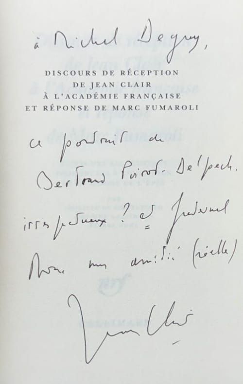Paris Gallimard 2009 1 vol. broché in-12, broché, couverture à rabats, non coupé, 129 pp. Première édition publique de cet hommage à Bertrand Poirot-Delpech, suivi de la réponse de Marc Fumaroli et des allocutions prononcée à l'occasion de la remise de l'épée par Philippe de Montebello, Antoine Gallimard, Pierre Nora. Envoi autographe signé de l'auteur à un poète et critique. Très bon état.