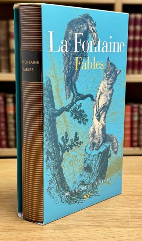 1769 A Paris: 1769. Complet en 2 tomes rel. en 1 vol. in-12: 11 x 17 cm, 3 ff. n. chiff. [faux-titre, portrait frontispice, titre au tome 1er], lii pp. + 1 pl. grav. [épître, avertissement, préface, vie d'Espoe, tables], 284 pp. [Fables, livres I à VI], 1 bl., 1 f. n. chiff. [titre au tome 2nd], x pp. [tables du tome 2nd, extrait du privilège], 388 pp. [Fables, livres VII à XII, Philemon et Baucis, Les filles de minée, La matrone dÉphèse, Belphégor]. Charmante et peu commune édition illustrée des Fables de la Fontaine. Volume orné d'un portrait de La Fontaine par Rigaud en frontispice, une belle figure hors-texte représentant Ésope, une vignette en-tête aux armes du Dauphin, ainsi que 243 vignettes, une en-tête de chaque fables! Les figures sont reprises de l'édition de 1746. (DESPRÈS, Les éditions illustrées des fables de la Fontaine,1892, no. XVII). Elles furent dessinées alors par Cochin et De Sène d'après les figures de Chauveau. Ces derniers complètent le bestiaire de Chauveau de huit dessins originaux pour les fables non encore illustrées dans l'édition de 1674-1694. Reliure de l'époque en veau marbré. Dos à cinq nerfs avec pièce de titre en maroquin rouge et caissons ornés de fers à glands. Tranches rouges et gardes recouvertes de papier marbré. Très bel exemplaire en remarquable état, grand de marge.