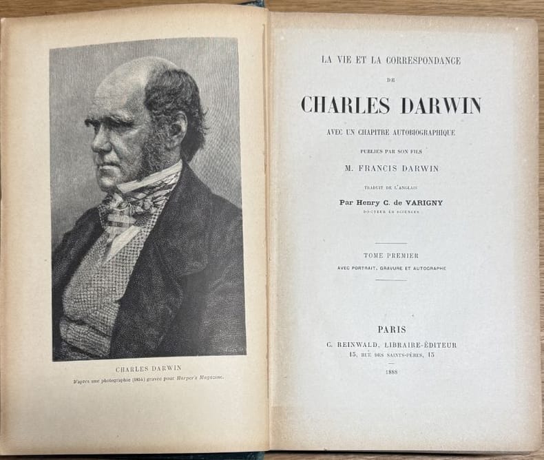 Paris, C. Reinwald, 1888, in-8, 2 vol, front, IX-701-[2] pp, 1 pl. + front, [4]-794 pp, 1 pl, 20 pp. de cat. éd, Toile verte moderne, Première édition française, rare. Au total, elle comprend 3 portraits de Charles Darwin, dont 2 en frontispice, le fac-similé d'une page de notes manuscrites et 1 figure dans le texte représentant le navire "le Beagle" échoué dans la rivière Santa-Cruz. Vie et correspondance de Charles Darwin (1809-1882) par son fils Francis (1845-1925). Francis Darwin, botaniste spécialisé en physiologie végétale, collabora avec son père à partir de 1875, notamment pour la rédaction de The Power of Movement in Plants (1880). Il enseigna à Cambridge à partir de 1884 et y occupa la chaire de botanique de 1888 à 1904. In fine: catalogue de la librairie Reinwald pour mars 1888. Ex-libris manuscrit sur le faux-titre du t. I. Auréole en pied des feuillets du tome II. Couverture rigide