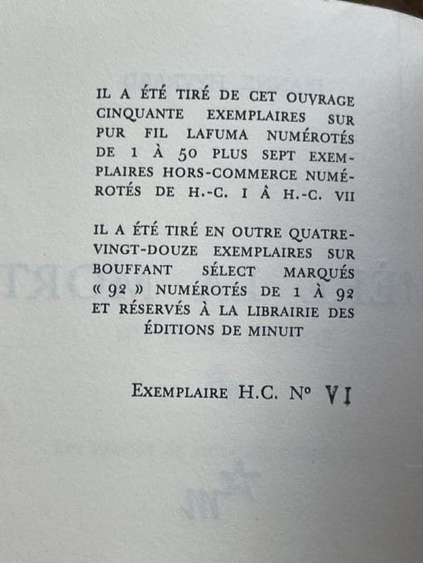 Paris Editions de Minuit 1976 1 vol. broché in-8, broché, non coupé, 159 pp. Edition originale. Un des 57 exemplaires de tête numérotés sur pur fil Lafuma, et parmi ceux-ci l'un des 7 hors commerce (justifié HC VI). En parfaite condition.