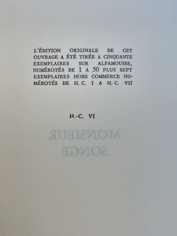 Paris Editions de Minuit 1982, 1984 et 1985 3 vol. broché 3 vol. brochés, non coupés, 135, 57 et 78 pp. Edition originale de ces trois petits recueils de notations intimes, souvent très drôles, qui seront réunis par la suite au format poche. Songe est un double de l'auteur, à la manière du Plume de Michaux ou du Monsieur Teste de Valéry. Chaque volume, tiré à une cinquantaine d'exemplaires sur beau papier, est l'un des 7 hors commerce (numérotés VI), avec un envoi autographe signé de l'auteur à Henri Causse, directeur commercial des éditions de Minuit. En parfait état.