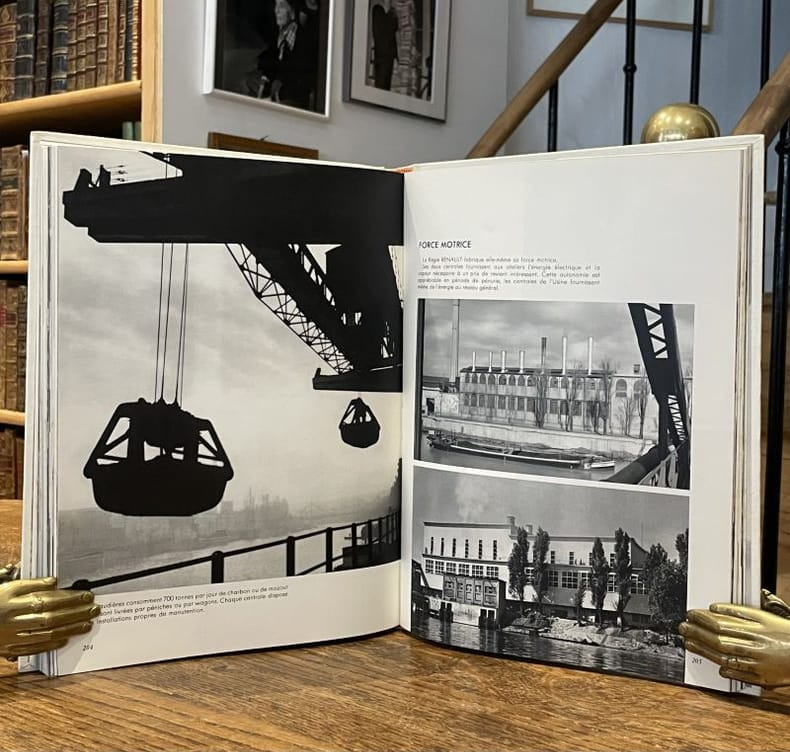 Billancourt Régie Nationale des Usines Renault 1951 1 vol. relié in-4, bradel cartonnage éditeur ivoire, titre doré au dos et sur le plat supérieur, étui, 251 pp. Bel album imprimé par Draeger et illustré d'un reportage présentant les différentes étapes de la fabrication d'une voiture aux défuntes usines Renault de Billancourt : 265 photographies en premier tirage et en héliogravure par Robert Doisneau, Willy Ronis, Nora Dumas, Ergy Landau, René Jacques, etc. Avec des textes en édition originale par Jules Romains, André Siegfried, Jean Cassou et Georges Friedman. Très bel exemplaire.