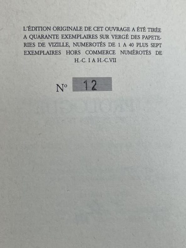 Paris Editions de Minuit 1991 1 vol. Broché in-12, broché, non coupé, 122 pp. Edition originale. Un des 47 exemplaires numérotés sur vergé de Vizille, seul grand papier. En parfait état.