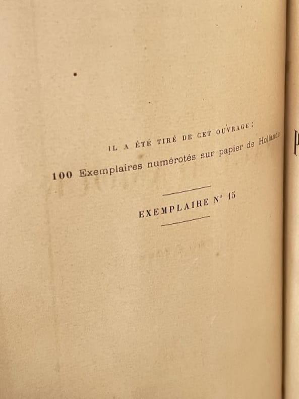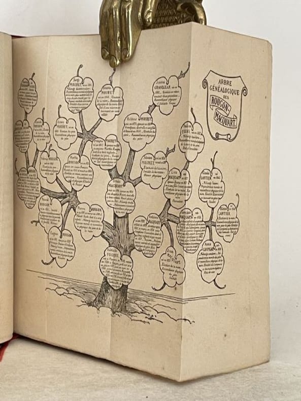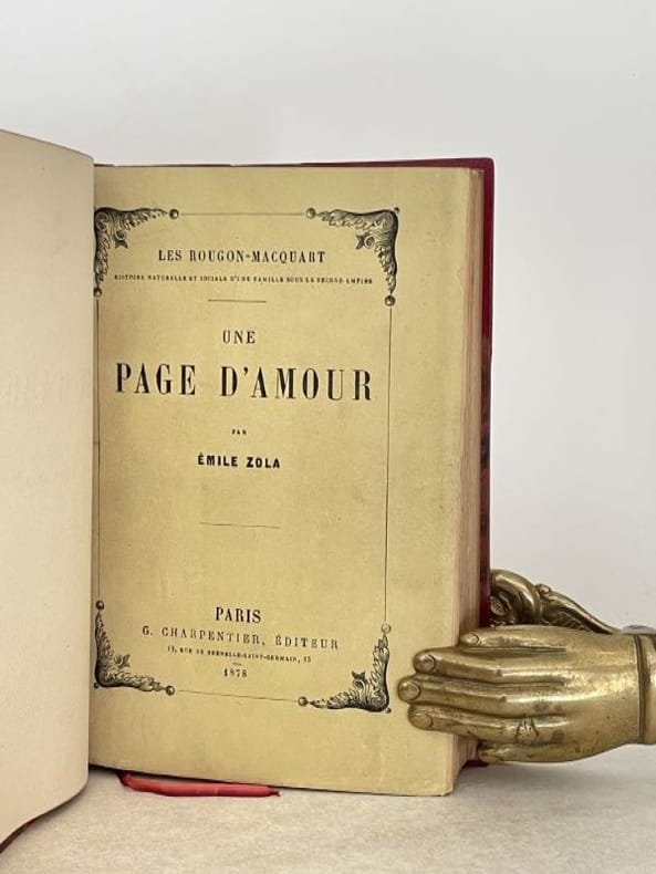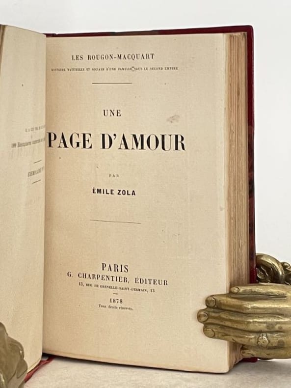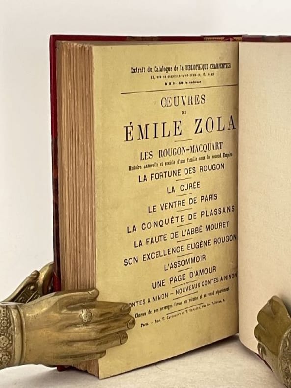 Paris Charpentier 1878 1 vol. Relié in-12, demi-maroquin rouge à coins bordé de filets à froid, dos plat à faux nerfs orné de deux caissons décorés de filets et guirlandes à froid avec cartouche central mosaïqué de maroquin vert, tête dorée, couvertures conservées, non rogné (René Kieffer), VII + 406 pp. Edition originale bien complète de l'arbre généalogique dépliant des Rougon-Macquart. Un des 100 exemplaires numérotés sur Hollande, seul tirage en grand papier (n°15), dans une agréable reliure signée d'inspiration art nouveau. Ex-libris Franchetti.