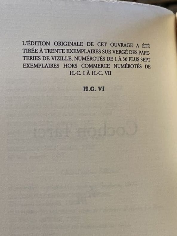 Edition originale. Tirage de tête : un des 30 exemplaires du tirage numéroté sur pur-fil Lafuma (seul papier) ; plus 7 hors-commerce. ''Personne ne peut dire si c’est la farce qui améliore le cochon ou si c’est le cochon qui donne à la farce sa pleine saveur. Ce qui est sûr c’est que le contenu participe du contenant, et vice versa, pour donner au tout l’agrément nécessaire à sa consommation. Ce cochon-ci est farci avec les éléments de sa propre constitution agrémentés d’épices exotiques et d’herbes de saison.'' Très belle condition.
