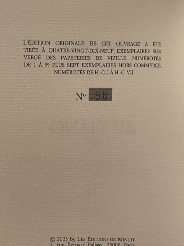 Paris Editions de Minuit 2002 1 vol. Broché in-8, broché, non coupé, 222 pp. Edition originale. Un des 106 exemplaires numérotés sur vergé de Vizille (seul grand papier). En parfait état.