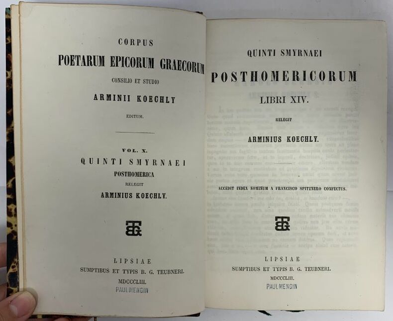 Leipzig Sumptibus et Typis B. G. Teubneri 1853 1 vol. relié in-12, demi-maroquin fauve, dos à nerfs, caissons ornés de motifs dorés, tête dorée, non rogné (David), XXXII + 318 pp. Bonne édition grecque avec index des noms en latin. Parfaite reliure de l'époque par David.