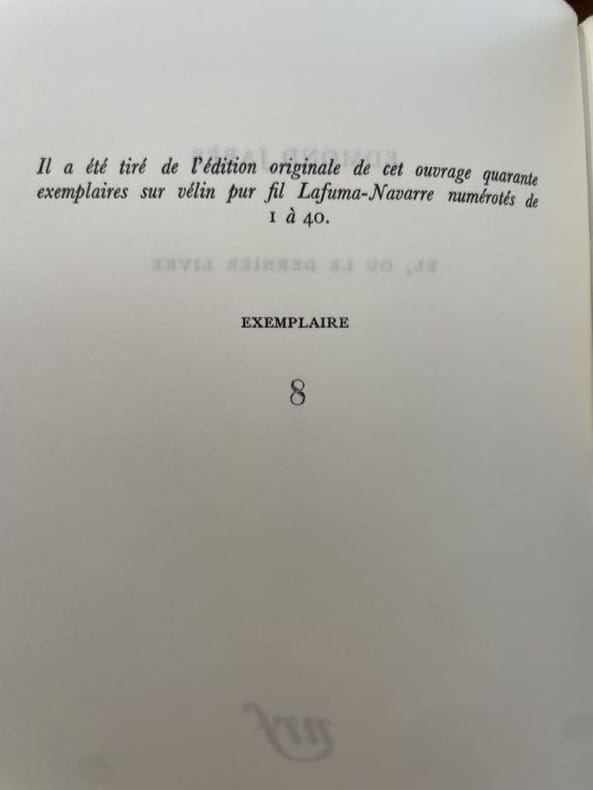 Paris Gallimard 1973 1 vol. Broché in-8, broché, couverture à rabats, non coupé, 123 pp. Edition originale. Un des 40 exemplaires numérotés sur vélin pur fil Lafuma-Navarre, seul grand papier. En parfait état.