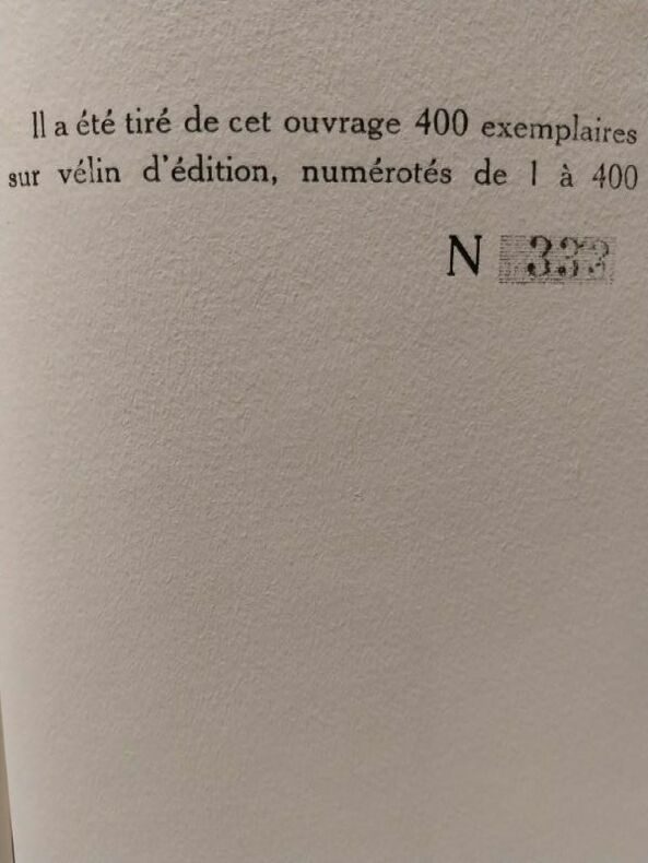 Sous étui bordé et sous chemise en demi-maroquin noir à petits recouvrements. Reliure maroquin noir à encadrements. Plaques holographiques serties sur les plats. Dos lisse avec titre doré en long à la chinoise. Doublures et gardes de papier Japon gris à fibres apparentes. Toutes tranches dorées. Couverture et dos conservés. Reliure signée G. CLAES - 1984.