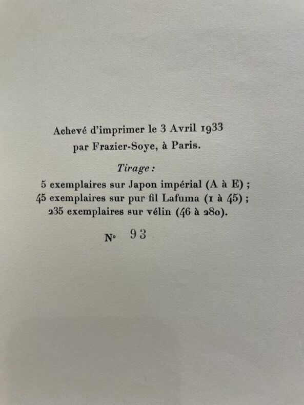 Paris Librairie du Luxembourg 1933 1 vol. broché plaquette gr. in-8, brochée, couverture rempliée, non paginée. Edition originale de ce recueil de la meilleure veine surréaliste. Tirage limité à 285 exemplaires, celui-ci numéroté sur vélin. Poème de Cocteau recopié sur la dernière page, d'une écriture non identifiée.