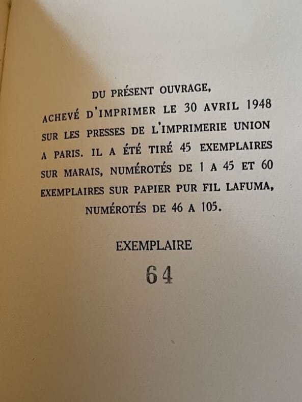 Paris Corti 1948 1 vol. broché in-12, broché, couverture rempliée, non coupé, 149 pp. Edition originale. Un des 60 exemplaires numérotés sur pur fil Lafuma. En excellente condition.