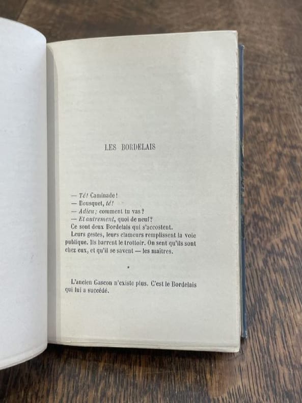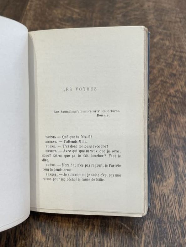Paris Michel Lévy, coll. "Hetzel & Lévy", s.d. 1859 1 vol. relié in-32, bradel demi-percaline bleu gris à coins, pièce de titre de basane aubergine et fleuron doré au dos, tête dorée, couvertures conservées (Carayon), 200 pp. Edition originale de ce recueil de petits dialogues lestes dédiés aux "musardines" parisiennes. Bel exemplaire, dans une bonne reliure signée de la fin XIXème.