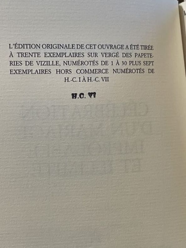 Edition originale. Tirage de tête : un des 30 exemplaires du tirage numéroté sur vergé de Vizille(seul papier) ; plus 7 hors-commerce. ''Quelque part dans le monde un festin se prépare, des noces sont célébrées : la corporation des bouchers marie ses enfants. Pour honorer les deux tribus qui se lient, sont présentes les autres tribus de la confrérie/sororerie. On parle, on boit, on chante, on jure, on évoque le destin. Autour des convives, le temps, s'exprimant par le vrombissement des mouches, le bourdonnement des abeilles, le bruit des feuilles et les trilles têtus des merlettes, les asperge de questions fondamentales. Fiancée et fiancé sont absents de la fête.'' Très belle condition. Exemplaire en grande partie non coupé.