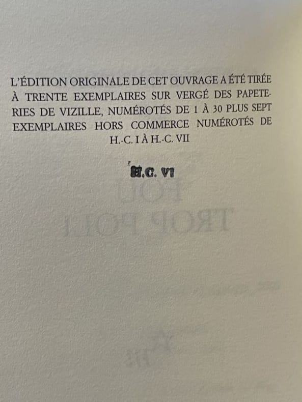 Edition originale. Tirage de tête : un des 30 exemplaires du tirage numéroté sur vergé de Vizille(seul papier) ; plus 7 hors-commerce. ''Quelqu'un crache sur les fleurs ou pisse dessus mais les vénère. On entend rouler les camions et on regarde passer les avions. On propose une illusion, un roman peuplé non pas de perruches mais de perriches, foutrepoli !'' Très belle condition.