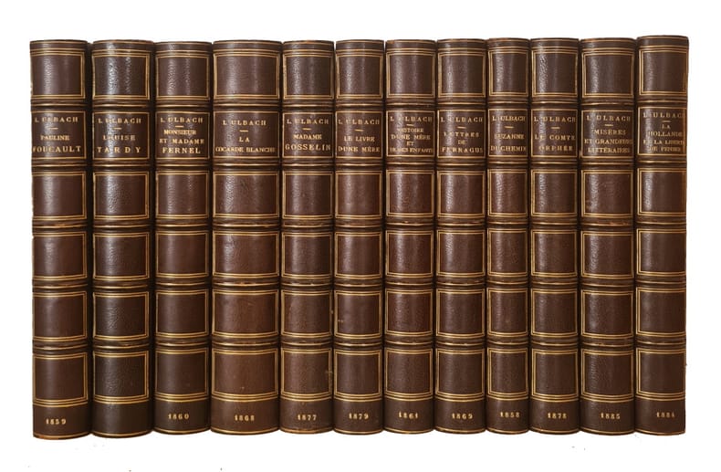 Paris 1858-1885 12 vol. Reliés 12 vol. in-12, demi-chagrin maroquiné vert foncé, dos à nerfs, double filet doré en encadrement sur les caissons, têtes dorées, non rognés (Petitot). Très bel ensemble en édition originale et reliure uniforme regroupant des oeuvres littéraires de la maturité d'Ulbach (1822-1889), ainsi que ses "lettres de Ferragus" publiées dans Le Figaro où il tenait chronique. Deux tomes, l'un de critique littéraire, l'autre sur la liberté de penser en Hollande, complètent les écrits de cet esprit indépendant. Deux volumes tirés sur Hollande comportent un envoi de l'auteur à l'un de ses éditeurs, A. Lacroix.