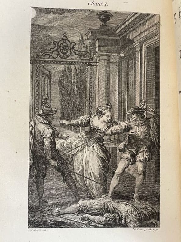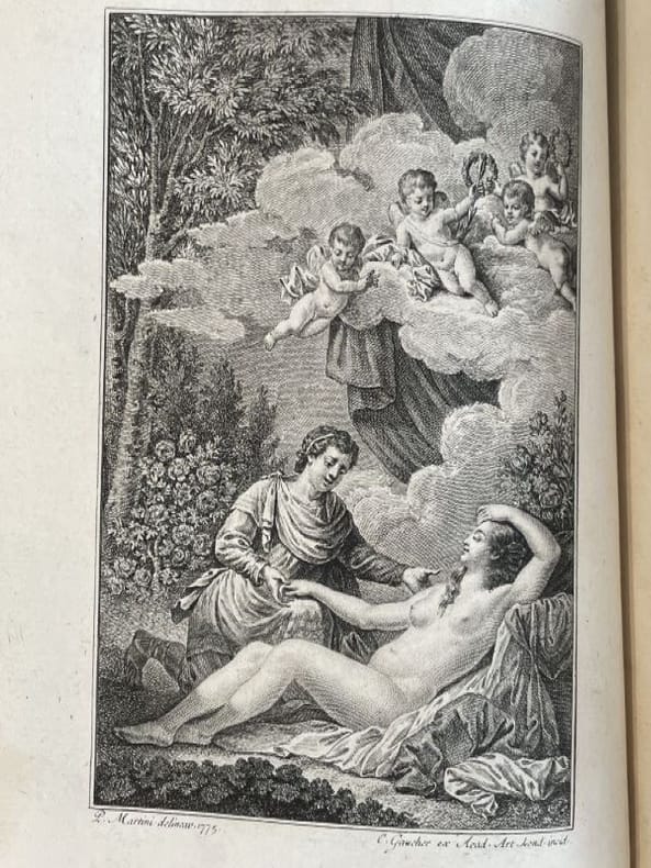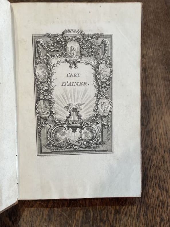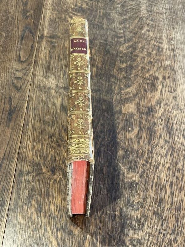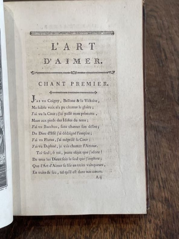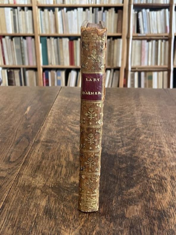 S.l.n.d. (Paris, Le Jay, 1775 et 1772), 1775 1 vol. Relié 2 ouvrages reliés en un volume in-8, plein veau fauve marbré, dos lisse orné de dentelle et filets dorés, pièce de titre de maroquin bordeaux, triple filet doré en encadrement sur les plats, coupes filetées, tranches rouges, 134-(2) et 55 pp. Réunion en édition originale de deux recueils de Bernard, le premier illustré d'un titre gravé et de 3 figures de L. Martini gravées par Baquoy, le second illustré de 4 belles figures de Eisen gravées par Ponce et Baquoy. Exemplaire sur grand papier dans une fine reliure de l'époque (mors et coiffe supérieure légèrement usés). Ex-libris gravé et cachet de bibliothèque.