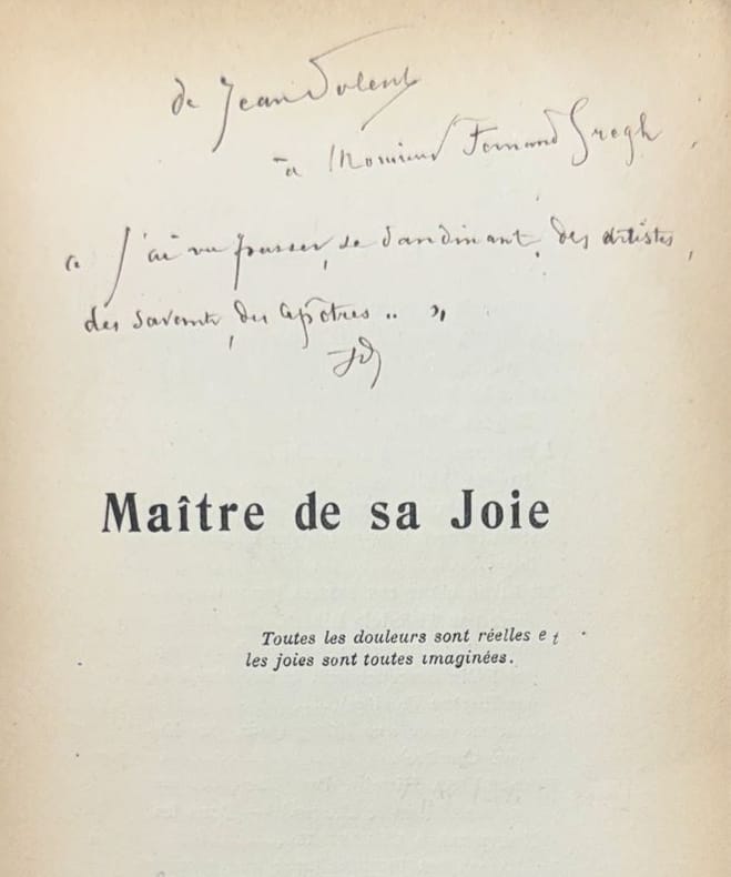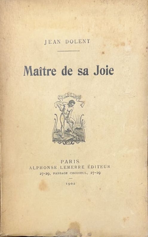 Curieux tapuscrit fait sur un papier de fabrication américaine (le "Cosmos Bond", produit par R. P. Andrews Paper Co. dans la première moitié du XXe siècle). On trouve à la fin du tapuscrit de "Maïtre de sa joie" une bibliographie des oeuvres de Dolent qui comporte de légères variantes par rapport à l'édition Lemerre et indique comme "à paraître" : "Maître de sa joie", "Les Matins" et "Les Parades de Jean Dolent". Ces deux derniers titres n'ayant jamais paru, nous pensons que ce tapuscrit a été composé antérieurement à la publication de l'intégralité du texte chez Lemerre en 1902. Nous ne savons pas, néanmoins, qui en est responsable ni à quoi il était destiné. On trouve sur les gardes deux mentions manuscrites : l'une fait référence à l'anthologie donnée par Charles Morice "Pages choisies de Jean Dolent", chez Messein en 1913, l'autre donne le nom de Pierre Caplain et son adresse. Pierre Caplain était le directeur de la maison de change dans laquelle Jean Dolent a travaillé toute sa vie. Dos passé et réliure frottée aux mors et aux coupes.