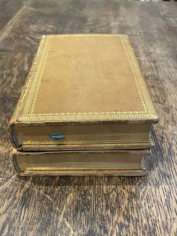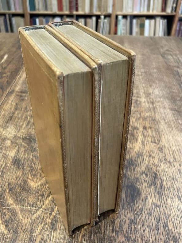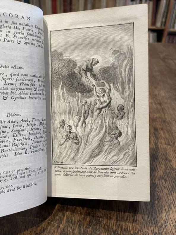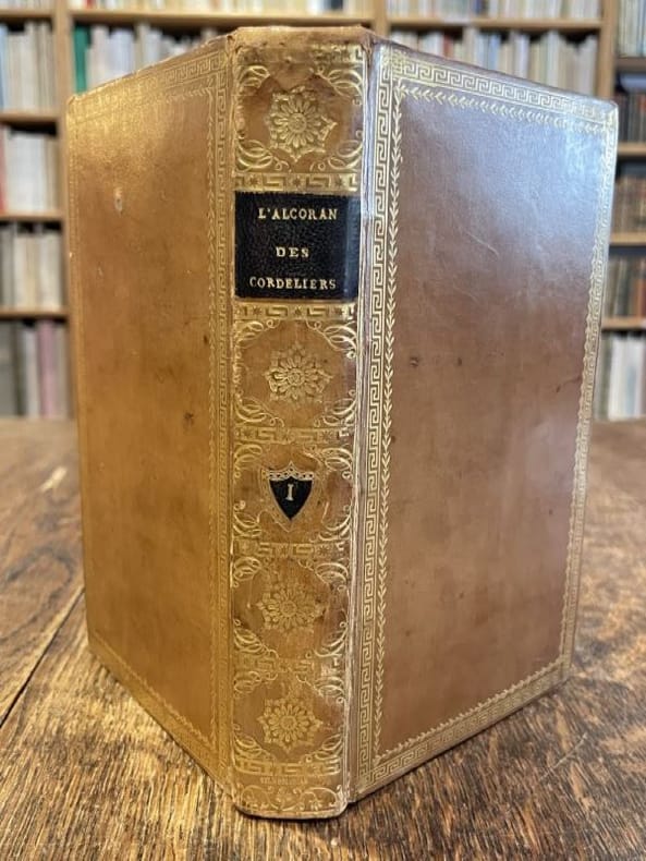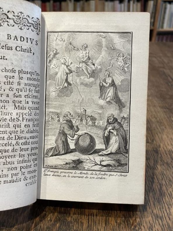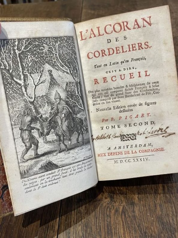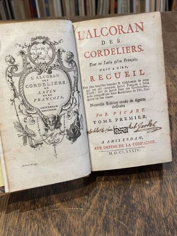 Amsterdam Aux dépens de la Compagnie 1734 2 vol. Reliés 2 vol. in-12, veau glacé blond, dos lisses richement ornés de frises, fleurons et dentelle dorés, pièces de titre et de tomaison noires, frise grecque et frise florale dorées en encadrement des plats, frise dorée sur les coupes, coiffes guillochées, tranches dorées (Rel. p. Bozerian), (12)-396 et 419 pp. Célèbre pamphlet luthérien contre les franciscains, dans la traduction de Conrad Badius parue pour la première fois à Genève en 1560. L'auteur y tourne en dérision l'hagiographie rédigée par Barthélémy de Pise qui présentait comme supérieurs les mérites de saint François à ceux du Christ... Premier tirage de l'illustration évocatrice de Bernard Picart comprenant un frontispice et 21 figures hors-texte dont une grande planche dépliante (Cohen, 5). Très bel exemplaire dans une fine reliure signée par Bozerian (Minimes frottements), avec deux ex-libris gravés, "Parlieu l'aîné, de Montpellier" et Anatole Basseville (1834-1923) avocat et érudit orléanais.