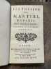 Paris Augustin Courbé 1650 In4 - plein veau d'époque - dos à nerfs - reliure en état moyen : mors inf. et Sup. fendus sur 3 cm - manque de cuir a la coiffe inférieure - coins frottés - épidermures aux plats - cachets Bibliothèque ecclésiastique sur la page de titre -603 pages - Se divise en Poésies théologiques , Poésies héroïques , Poésies morales , Poésies diverses et Épitaphes . Première édition collective du poète Jésuite Pierre Le Moyne ( 1602/1671)