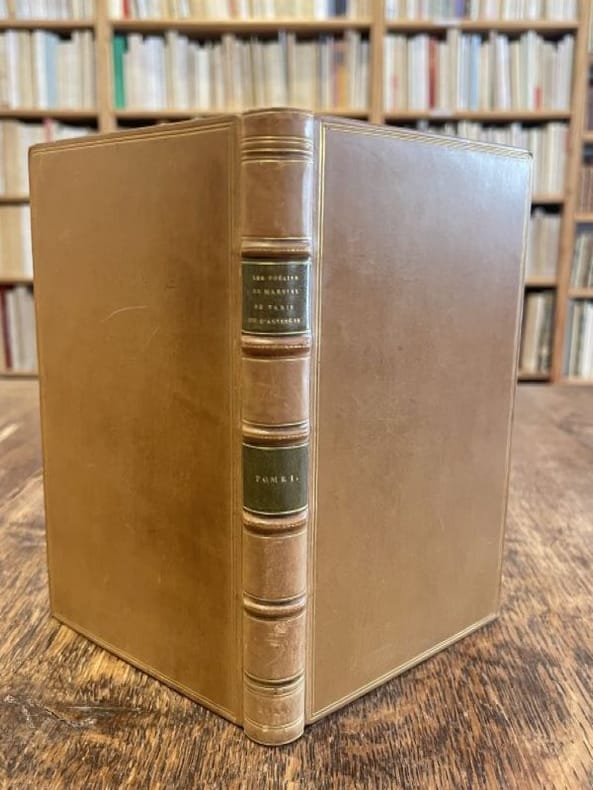 Fontainebleau; Paris: chez l'Auteur; chez Delaunay, libraire au Palais-Royal (1er ouvrage); chez Delloy (2ème ouvrage), 1836 - 1840 2 ouvrages reliés en un volume in-8, xxvi-180 pages et frontispive (portrait de l'auteur) xl-196 pages (les pages xxxvii-xl et 7-10 sont inversées). Demi reliure basane d'époque, dos lisse orné, reliure usagée avec manque au dos, tranches marbrées, rares rousseurs. Le premier ouvrage commence par une "Notice sur M. Durand, menuisier à Fontainebleau et sur son poème par M. Clovis Michaux" dans laquelle se trouve une biographie détaillée de l'auteur, ouvrier, compagnon puis maître, et poète. Peu commun.