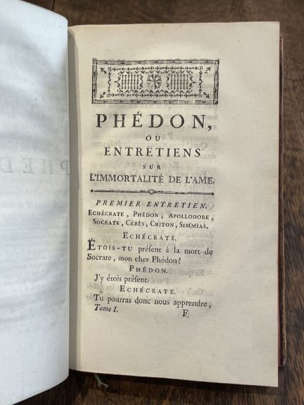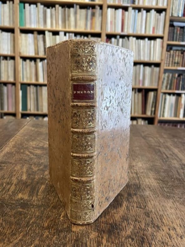 Paris et Bayeux Saillant et Lepelley 1772 1 vol. Relié in-8, veau fauve écaille, dos à nerfs, pièce de titre de maroquin rouge, caissons ornés de fleurons et dentelle dorés avec double filet en encadrement, coupes filetées, coiffes guillochées, tranches rouges, XXIV + 342 + (2) pp. Edition originale française ornée d'un beau frontispice d'après Monet, gravé par Ménil. Précédé d'une vie de Socrate, cet essai est composé en trois dialogues, à la manière du "Phédon" de Platon, à partir de la correspondance de Mendelssohn avec son ami Thomas Abbt. Infime galerie de ver au dos en pied, sinon très bon exemplaire en reliure d'époque avec ex-libris gravé Cazenove.