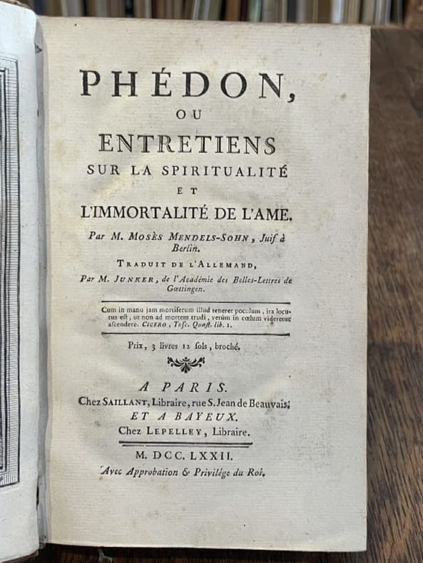 Première édition française donnée par Junker. Gravure de Ménil d'après Monet en frontispice.Traduit deux fois en français en 1772, d'abord par un pasteur huguenot à Berlin (Abel Burja sous le titre : Phédon ou Dialogues Socratiques sur l'Immortalité de l'Ame), ensuite par G.-A. Junker, un Allemand installé à Paris qui s'était déjà signalé par plusieurs traductions de l'allemand l'anglais, il le fut rapidement aussi en hollandais, italien, suédois, polonais, russe et hongrois. Le 1er juillet 1772, la Correspondance littéraire de Grimm en prit acte : « traduit depuis peu le Phédon, ou Entretiens sur la spiritualité et l'immortalité de l'âme, non de Platon mais de Mosès Mendelshon [sic], juif, à Berlin. M. Mosès jouit d'une grande réputation en Allemagne. C'est un célèbre métaphysicien et son Phédon a fait quelque sensation à Paris, quoique la philosophie dominante ne soit pas dans ce goût-là. M. Mosès s'est permis de mettre dans la bouche de son Socrate beaucoup d'arguments et de raisonnements tirés de la philosophie moderne en faveur du système de l'immortalité de l'âme. Ce Socrate au lieu d'être le maître de Criton et des autres philosophes d'Athènes, n'est qu'un élève de Leibnitz, de Wolff et de Mosès » (P. H. Meyer, Le rayonnement de Moïse Mendelssohn hors d'Allemagne).Très bon exemplaire. Cohen - De Ricci, 386 ; Szajkowski, Franco-Judaïca, 1625.