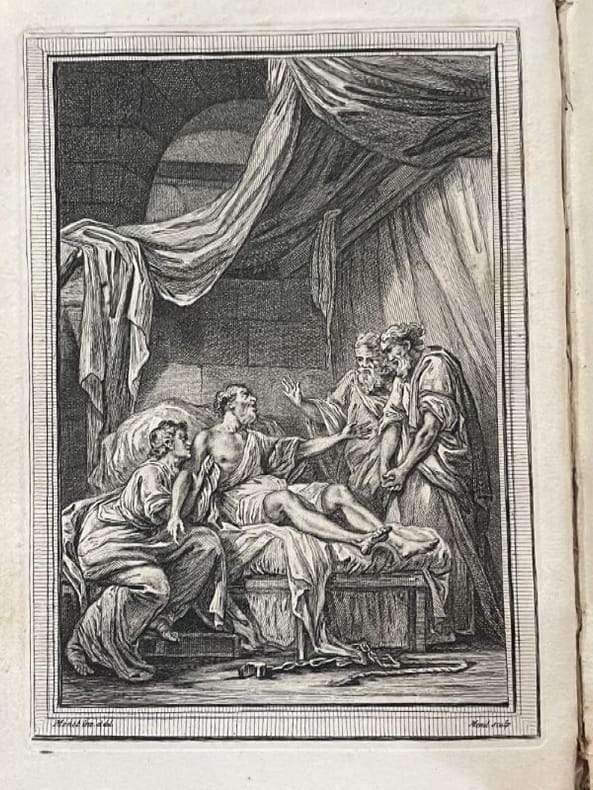 Première édition française. S'inspirant du dialogue homonyme dans lequel Platon met en scène les derniers instants de Socrate, le Phédon se propose d'accommoder les preuves métaphysiques de Platon au goût du siècle et met dans la bouche de Socrate des arguments qui sont ceux de Descartes ou de Leibnitz. C'est la principale oeuvre philosophique de Moses MENDELSSOHN (1729-1786), le premier philosophe juif de l'ère moderne. Ce livre fut l'un des plus populaires de son époque et fit l'objet de nombreuses rééditions. Beau frontispice gravé par Fessard d'après Monnet, et daté de 1769.