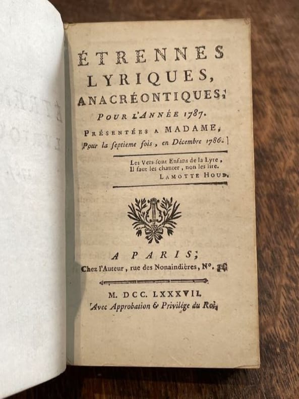 présentées à Madame pour la septième fois en Décembre 1786 - poésie amoureuse et poésie de banquet à la manière d'Anacréon - bon état général (good condition)