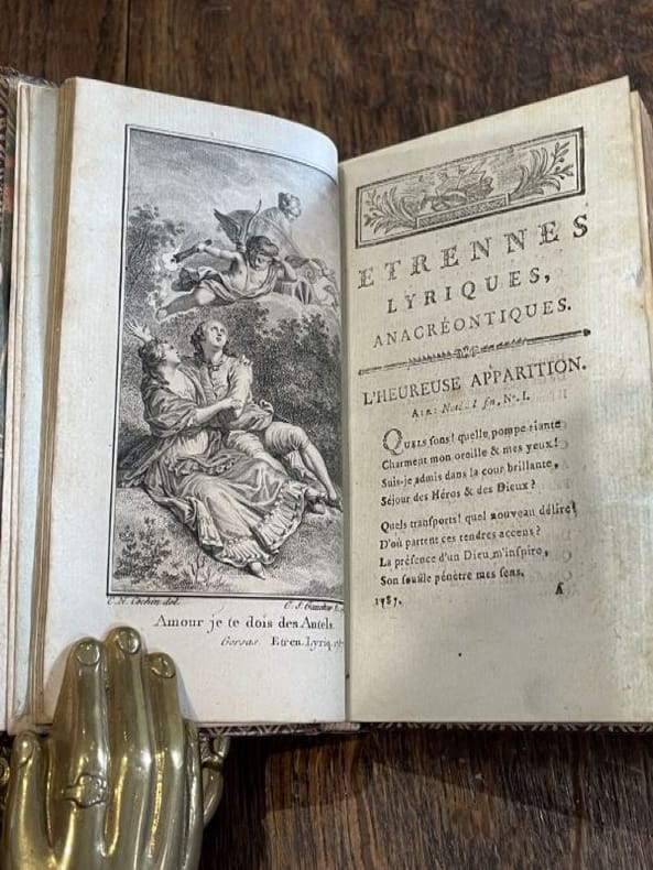 Paris, chez l'auteur, 1788. 1 vol. in-16, maroquin rouge, dos lisse orné de fleurons dorés, pièce de titre en maroquin vert, encadrement d'un triple filet doré sur les plats, petits fleurons dorés aux angles, filet doré sur les coupes, roulette dorée intérieure, tranches dorées. Reliure de l'époque un peu maniée. 1 fig. hors-texte de Cochin gravée en taille-douce par Gaucher, (11) ff., 324 pp. Les pp. 289 à 315 comprennent la musique gravée.